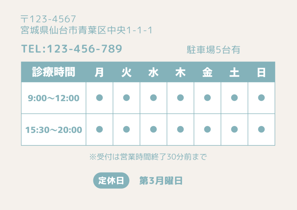 営業時間は毎日21時まで。土日祝日も営業しているから通いやすい。